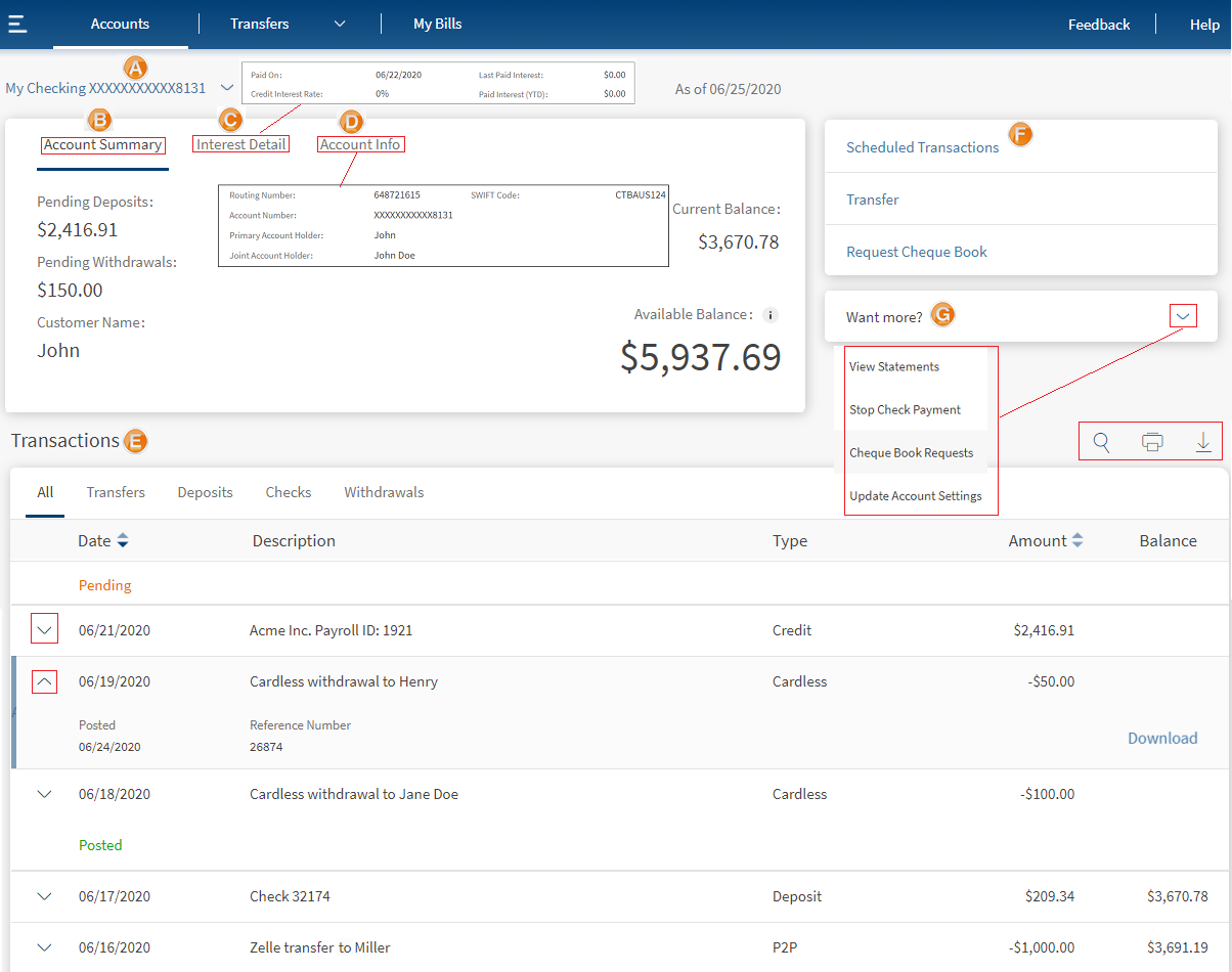 - View the account information (eCheck), account summary, and the balance details of the selected account.