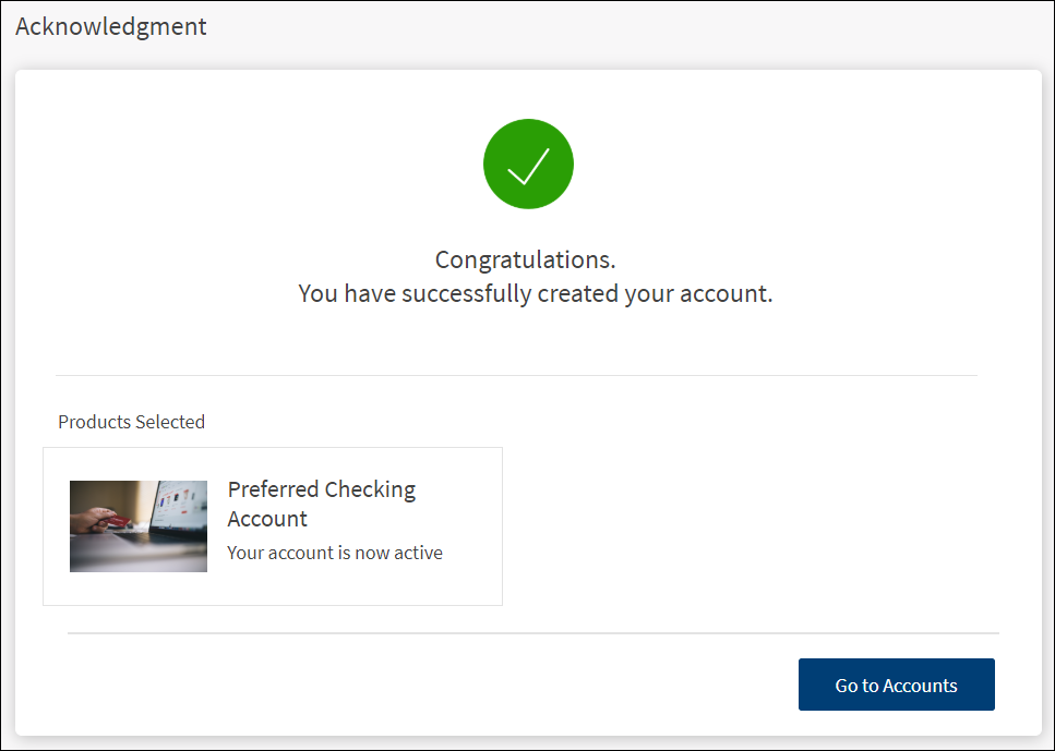 - The application displays an acknowledgment screen with a confirmation message that the account is created successfully, and also lists the accounts that you selected.