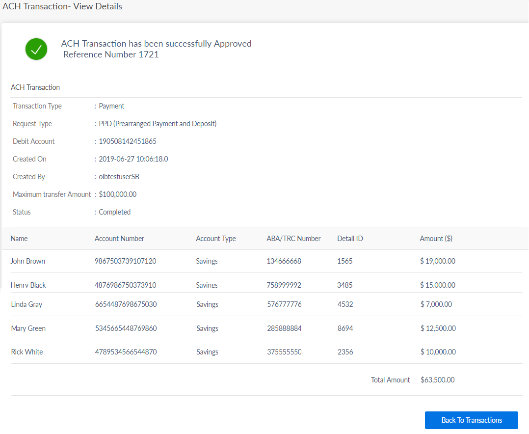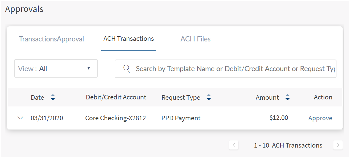 View the list of ACH transaction requests raised by the signed in user and needs approval to complete the transaction. If there are no ACH transactions requests raised that require approval, then the application displays an appropriate message