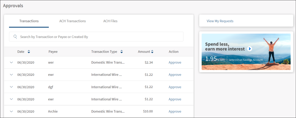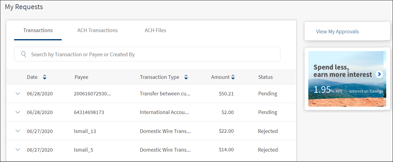View the list of transaction requests raised by the signed in user and needs approval to complete the transaction. If there are no transactions requests raised that require approval, then the application displays an appropriate message. All transactions except the (automated clearing house) ACH transactions are shown here.