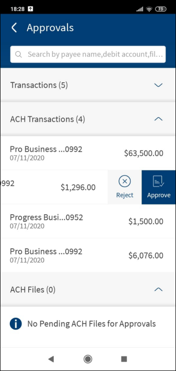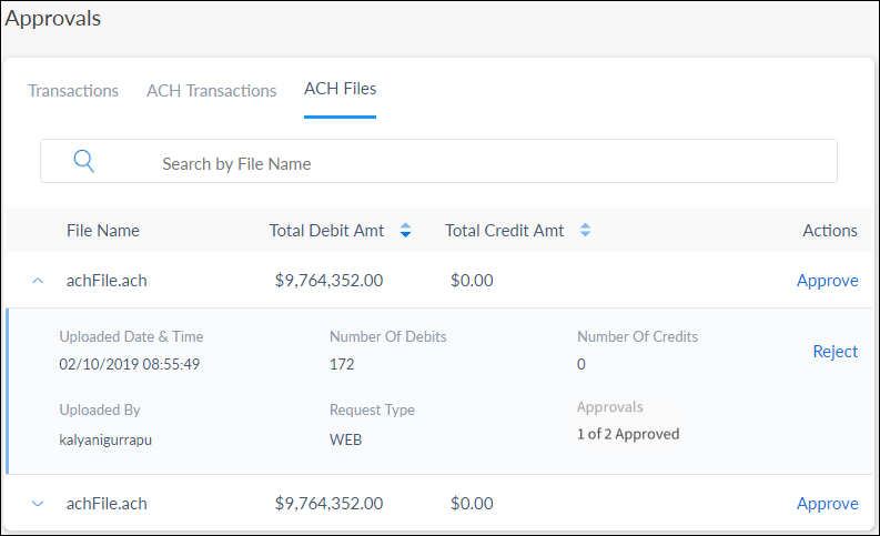 View the list of ACH files pending for your approval or rejection. The application lists only those files that have been explicitly sent to you for approval.