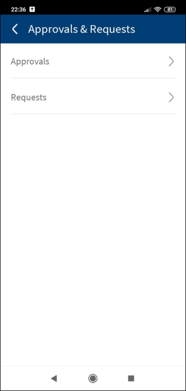 On the application dashboard, the application displays the Requests section on top section of the screen. If the user has raised few requests, then this section is displayed with the count in parenthesis. The count is updated for three sections - Pending, Approved, and Rejected. On tapping Requests, the application displays the page with details of the requests. The individual line items cannot be clicked and are for visual representation only. If the count is zero, still the Requests section is displayed with count as zero. If the user does not have access to raise requests, then the section is not displayed.