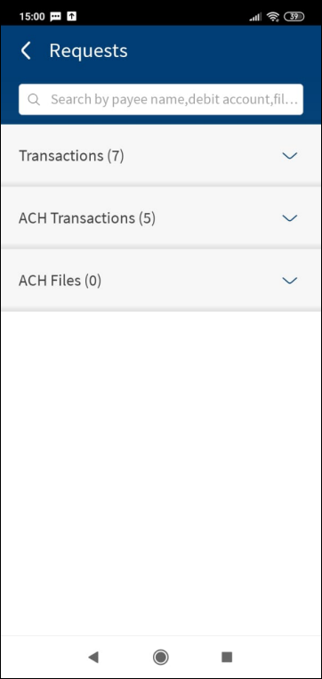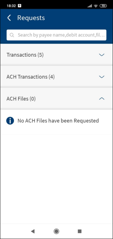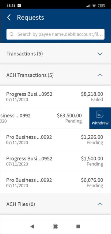 - Requests. Tap to view the list of transactions and ACH Files and withdraw transactions if required.