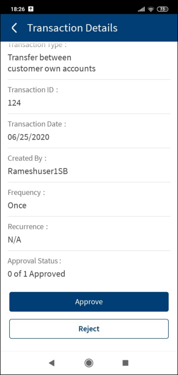 View the list of transactions pending for your approval or rejection. Transactions are seen here because you were set as an approver in the approval matrix for the account, feature, and transaction value. If there are no pending transactions that require your approval, then the application displays an appropriate message.