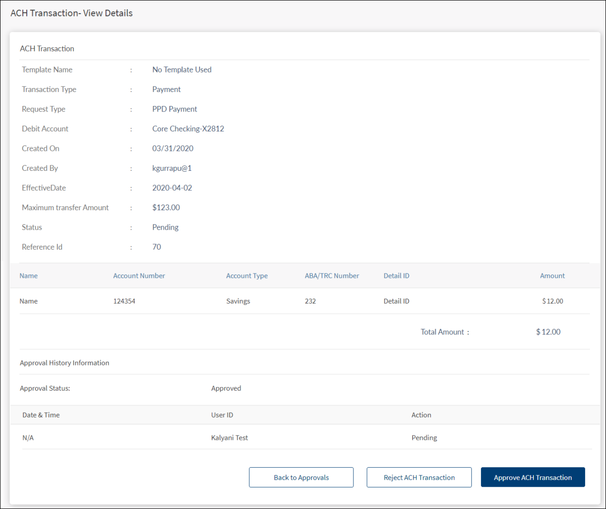 - Click to approve or reject the ACH transaction or go back to the approvals dashboard screen.