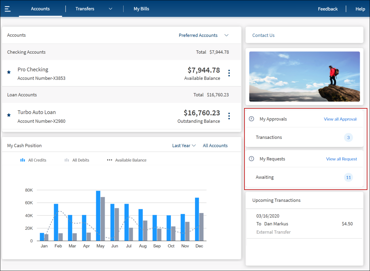 - A Financial Institution (FI) and authorized user (Business Owner) can set three types of approvals for transactions at pre-approved level (0-$500 transactions do not require approval), a range of approval threshold for which approval is required from a designated user or approval group, and auto denied amounts (anything over an amount is denied). These are applicable at User Level / Account level / Feature Level.