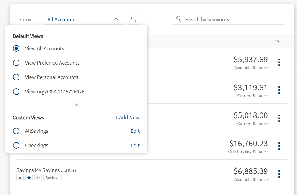 - Online Banking: Dashboard > Accounts list filter > Custom Views section > Select a view