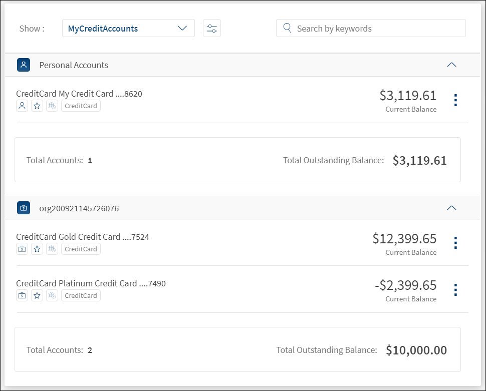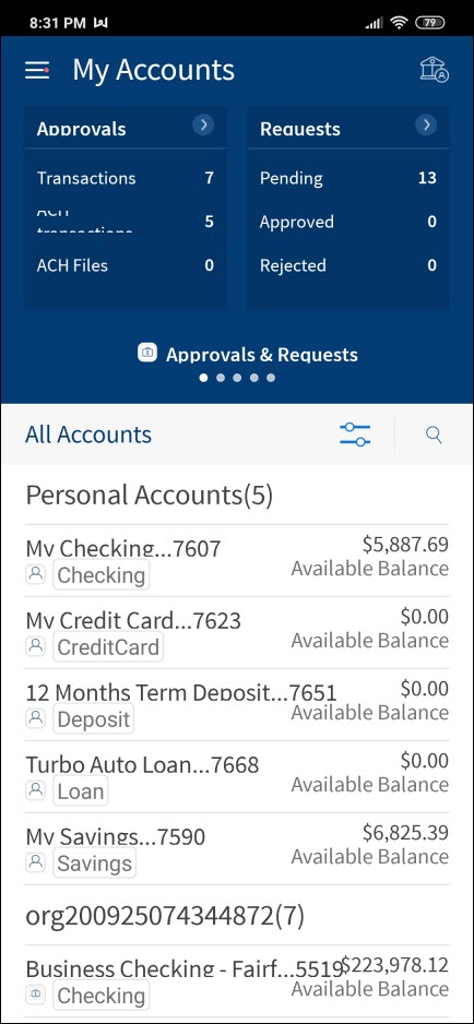 - For a business user, the application displays all business accounts that the business user has been given access. For a combined user, the application displays all business and personal accounts that the user has been given access.
