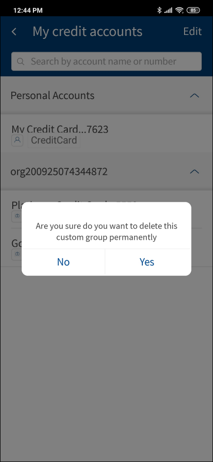 - Remove existing accounts. The accounts that are already part of the custom view are only displayed. Select the account check boxes to remove accounts. Tap Remove. The button is enabled only if any modification is done on the screen. The application displays a confirmation screen. Tap Yes to remove the selected accounts. The application displays an acknowledgment screen.