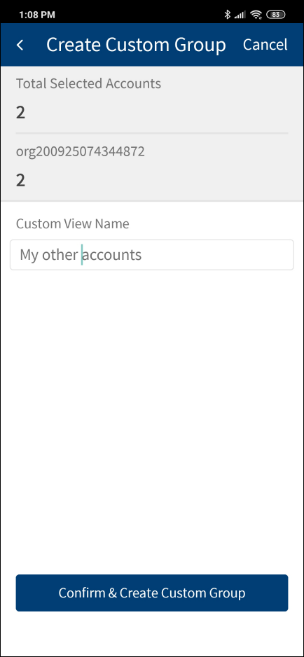 - Add more accounts. The application displays accounts that are not already part of the custom view. Select the account check boxes to add accounts. Tap Add Account. The button is enabled only if any modification is done on the screen. The application displays a confirmation screen. Tap Yes to add the selected accounts. The application displays an acknowledgment screen.