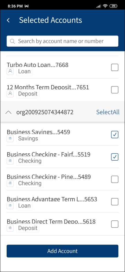 - Use the Select All check box to select all the accounts under the account type or business sections.
