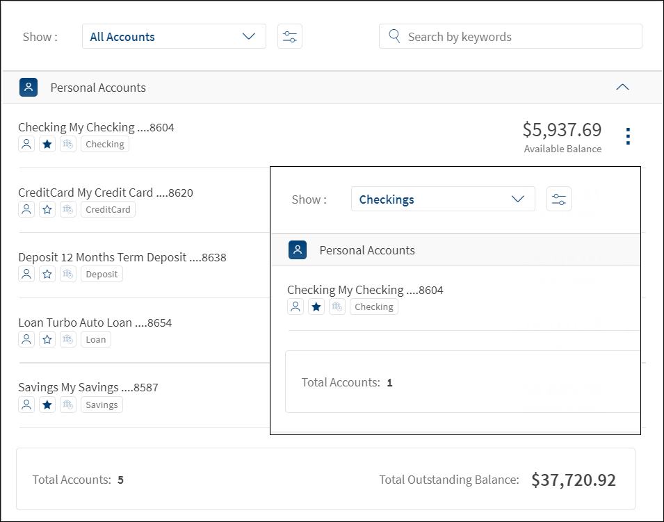 - Online Banking: Dashboard > Accounts list filter > Custom Views section