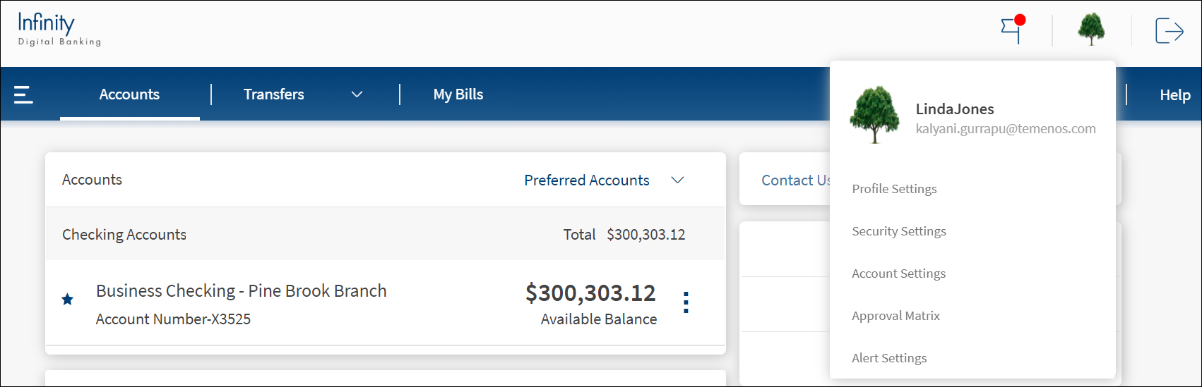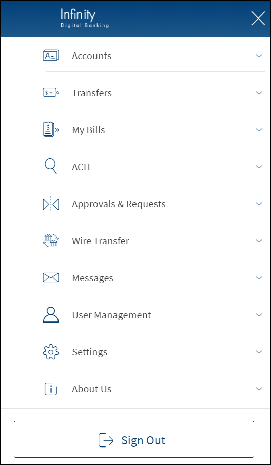 The visibility of the menu items on the hamburger or side menu is controlled through the permissions defined for the signed in business user. See permissions for more information on permission details and online banking menu for more information on the menu items and description.
