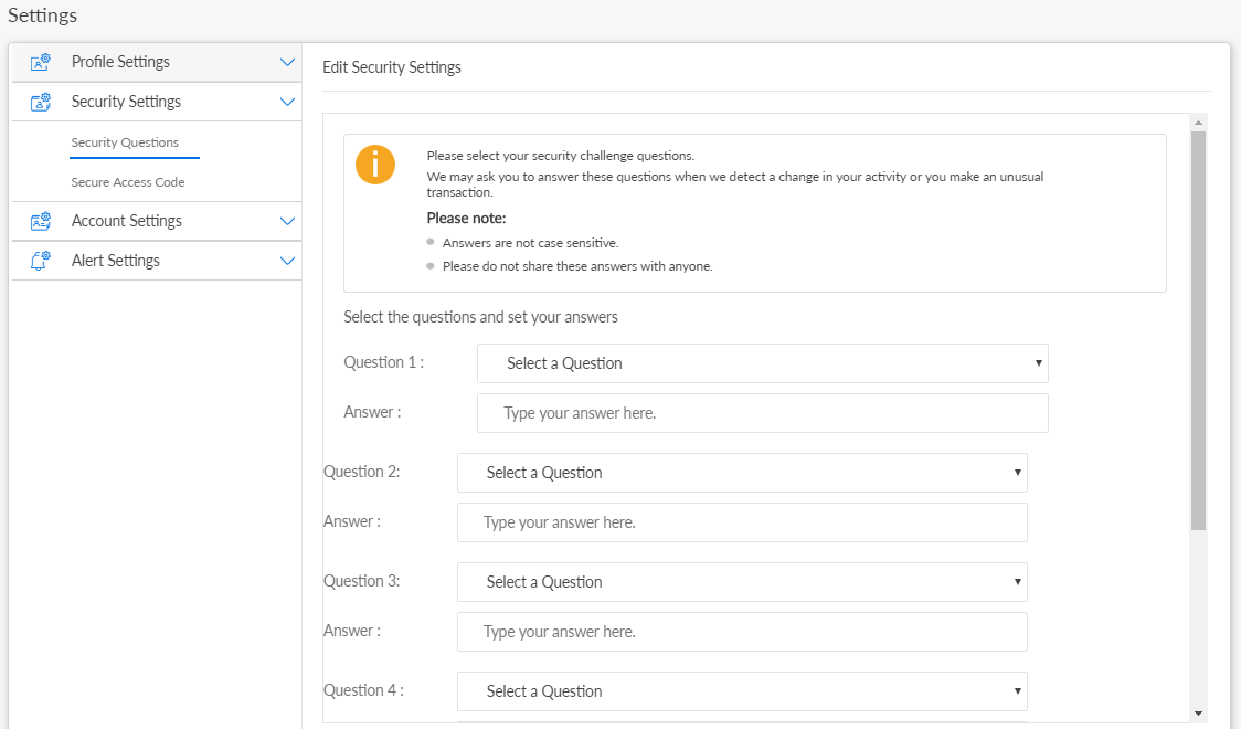 Under the Security Settings section, click Security Questions. If you have not set up the security questions earlier, you can set up the questions now. Otherwise, click Reset Questions. The app displays the Edit Security Settings screen.
