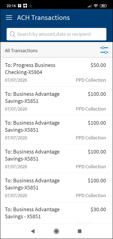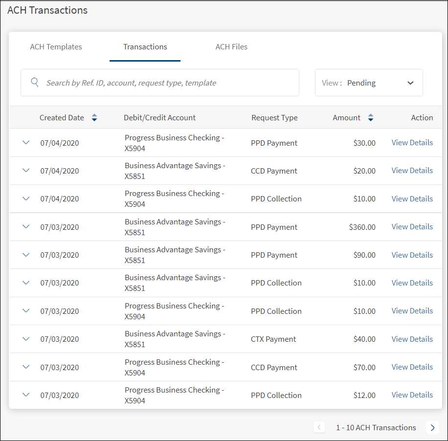 - Pending: All ACH collection and payment transactions that are pending approval of the logged in user.