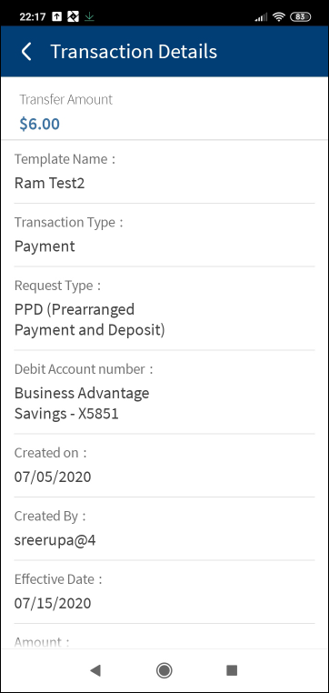 Tap any transaction to view details of the transactions and take further appropriate action depending on the status of the transaction. Search the list of transactions to find a certain transaction. To search any transaction, enter the reference ID, account name, request type, or the template name.