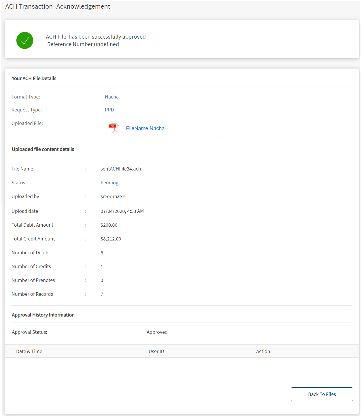 | If sum of credit and debit is above pre-approval limit | "Your ACH file has been uploaded successfully and will be submitted for approval". The status of the file is Pending. |