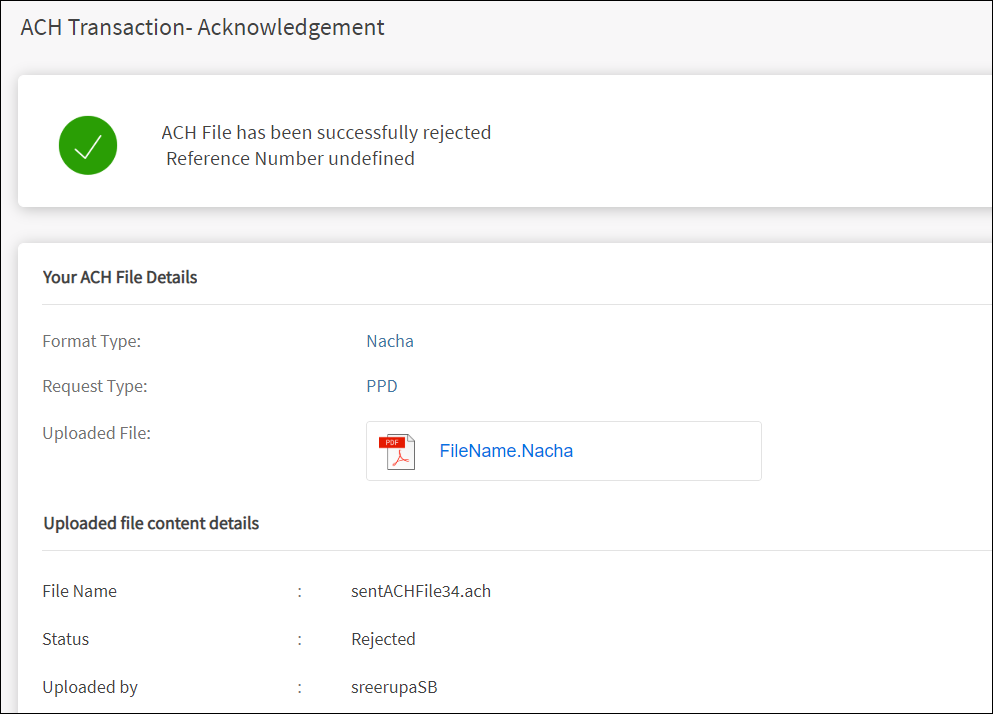 The following are a few error scenarios and the message displayed in the application while uploading an ACH file: