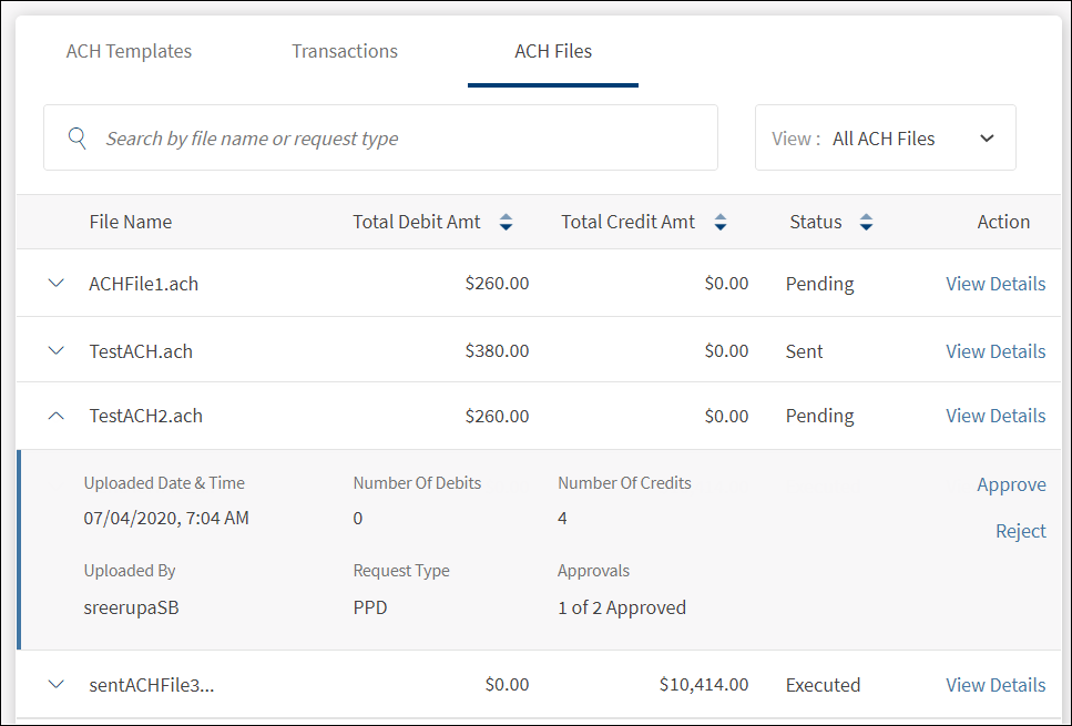Use the feature to view the ACH transactions and file list and approve the applicable pending transactions and files.
