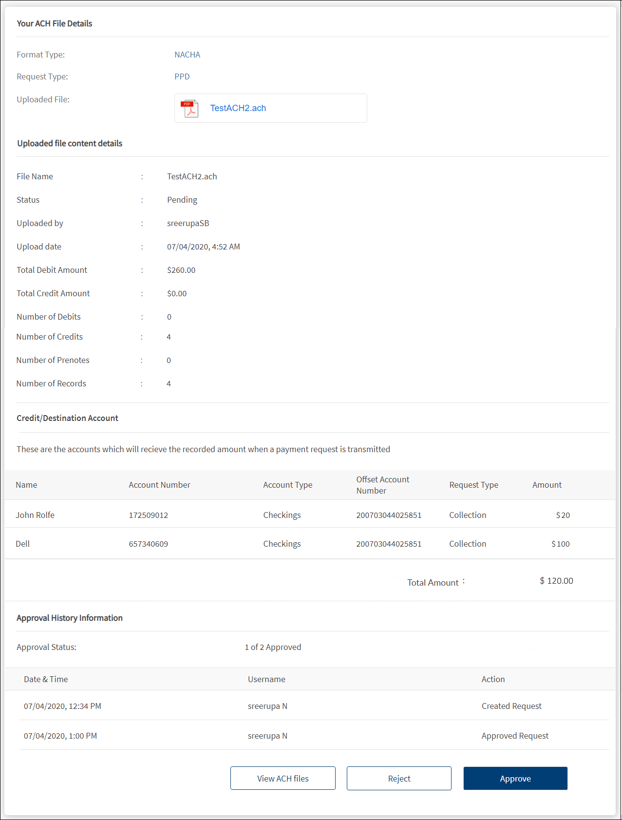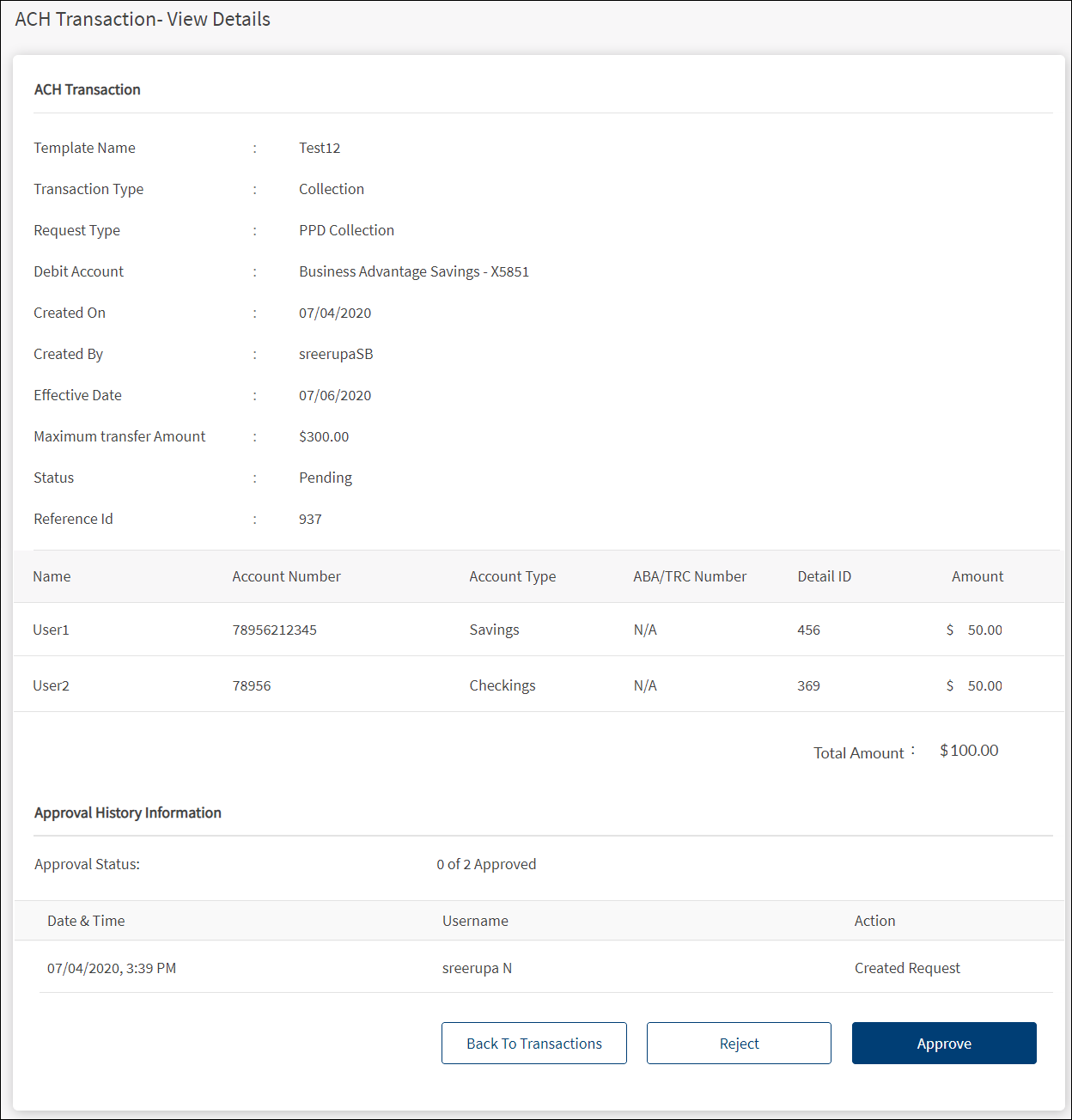 - Only the users with permission to approve ACH transactions can approve or reject transactions.