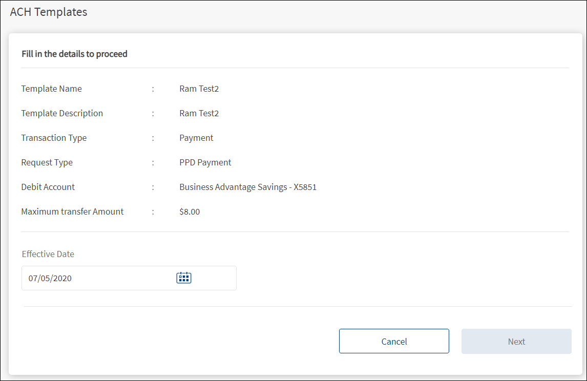 - On the ACH Templates tab, from the list of templates, click the Collect Payment or Make a Payment link. The application displays the template details screen based on the selected template.