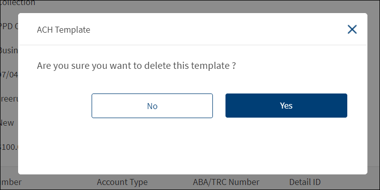 A business user with the required permissions ("Delete Templates" permission for ACH Payments / ACH Collections) can delete a payment or collection template respectively and the feature is visible only to these users. On deleting the template, the user is asked for a confirmation. After confirmation, the template is removed from the list and will not be available to any users.
