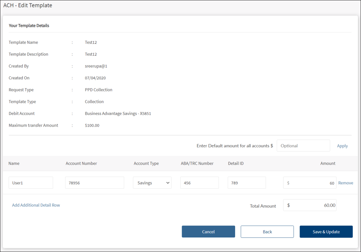 On the ACH templates tab, click any template row, and then click View Details. The application displays the additional details on the selected template.