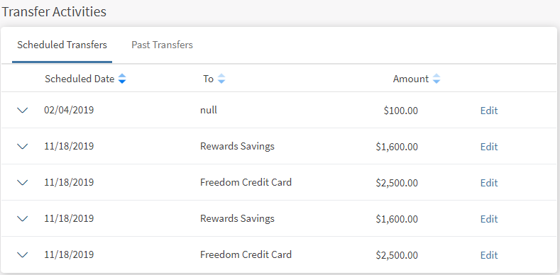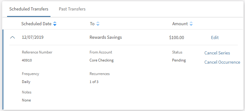 Use the feature to view the consolidated list of scheduled transfers. You can update or cancel a scheduled transaction.