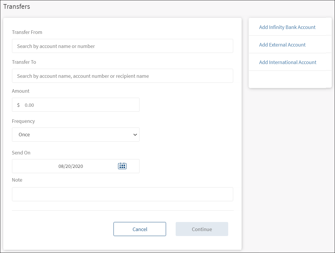 The Transfer feature can be used to transfer funds between accounts on the Send Money screen. You can initiate a new fund transfer to your own account in the same bank, recipients in the same bank, recipients in other banks that you have added, recipients in international banks, and wire transfers.