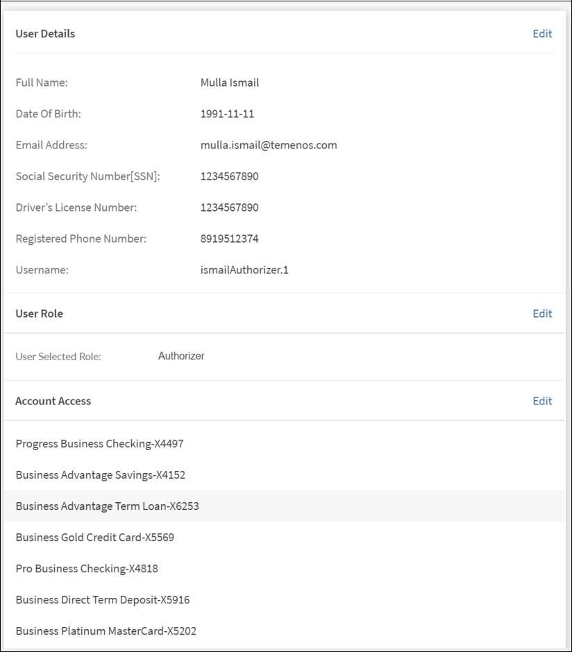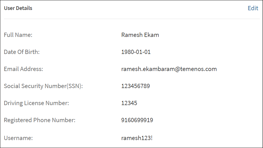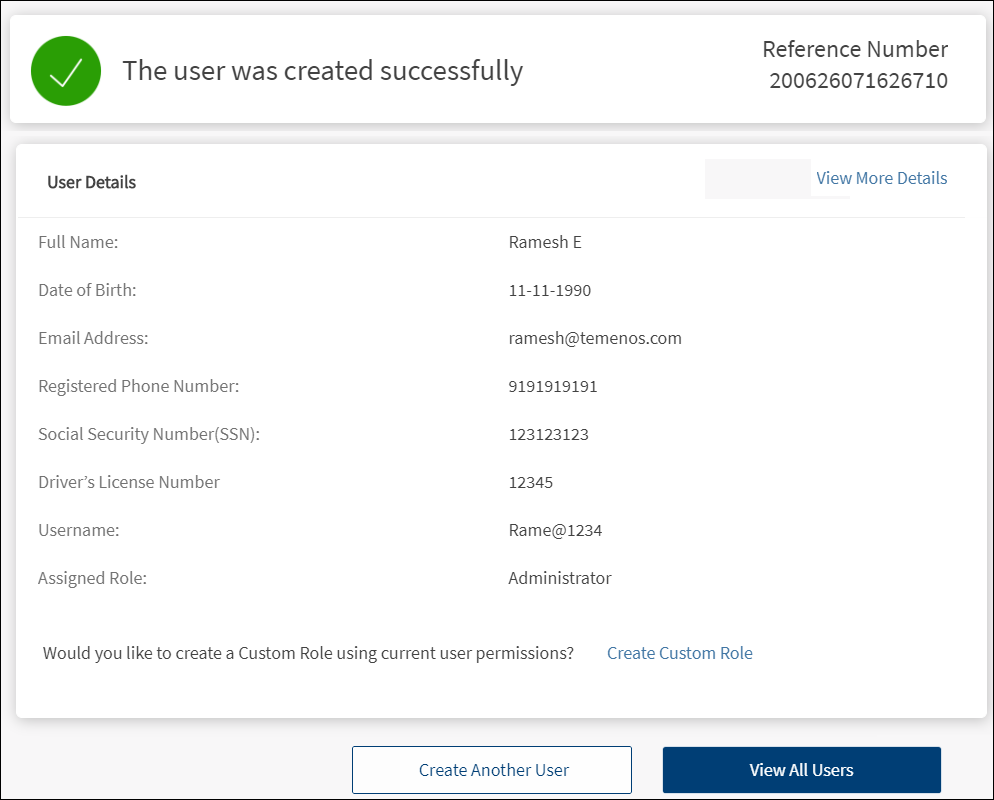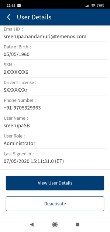 - View the user details such as full name, email ID, date of birth, SSN, driver's license number, phone number, user name, user role, and last signed in date.