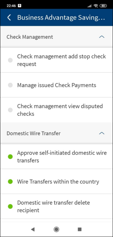 Tap any tab to view the corresponding details. You cannot edit any details. To view the details under Account Level Permissions and Transaction Limits, first select a specific account from the list of accounts. The tabs are displayed only if the business user has the necessary permissions. Use the up and down arrows to contract and expand the details.