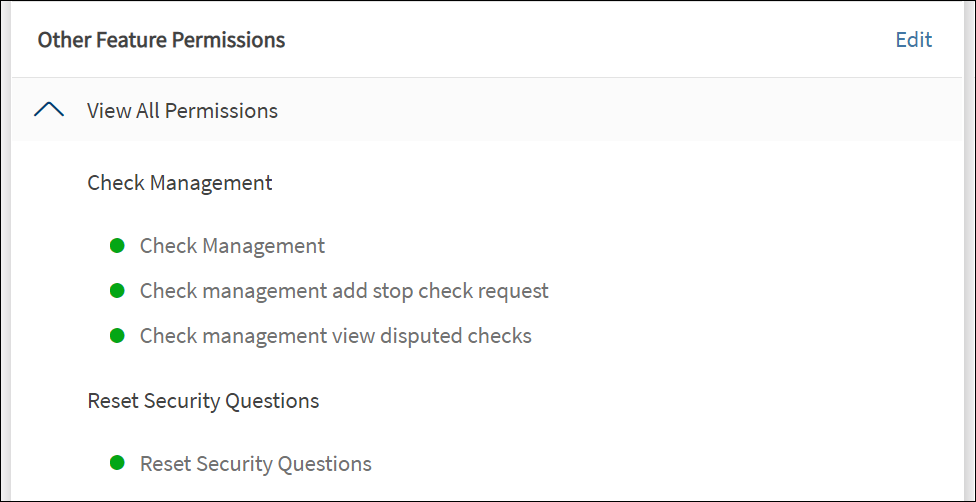 Displays the permissions given to the user to other non-transactional features. Make the changes by selecting or clearing the feature check boxes. Click Save & Update. The changes are updated.