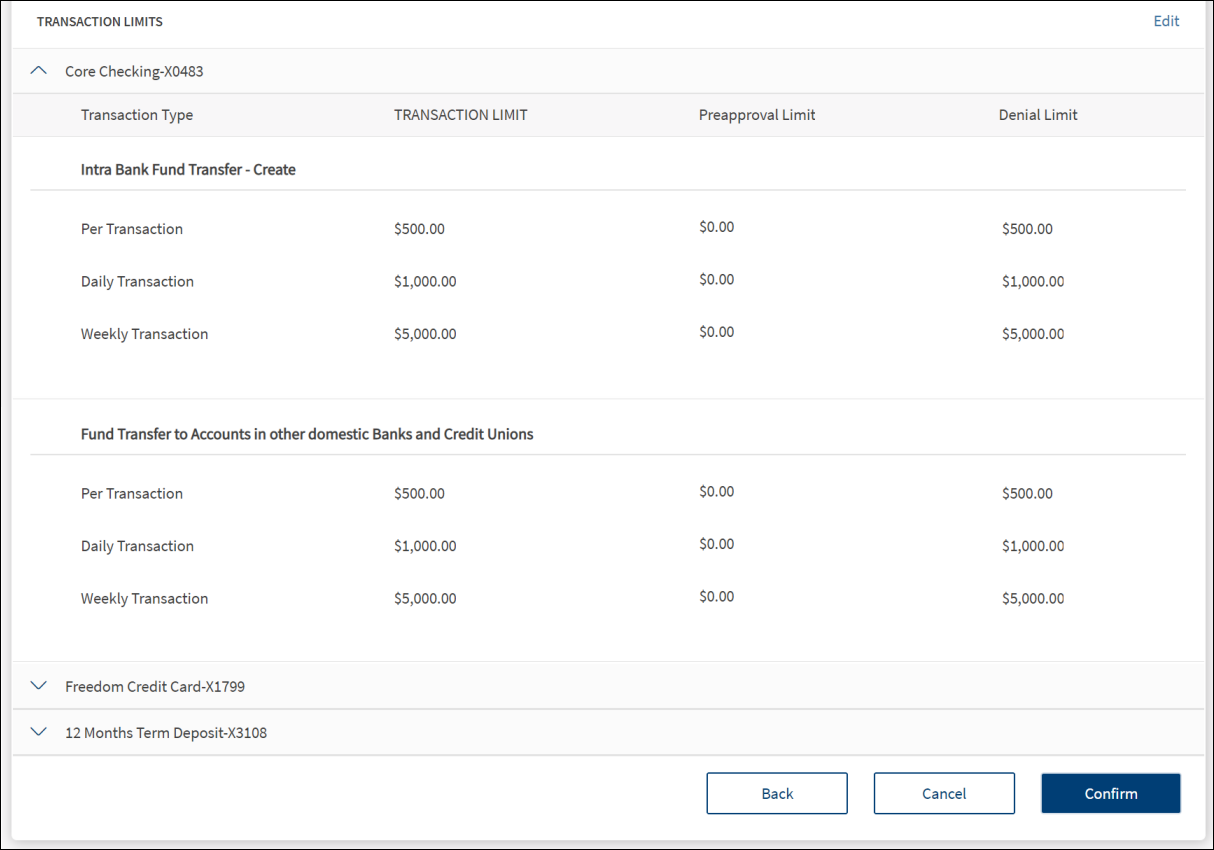 For features involving monetary transactions, define the transaction limits per transaction type (per transaction, daily, weekly) of every permitted feature of the selected accounts. Edit the pre-approved and denial limits as required. The application validates the pre-approved and denial values as defined at the company level where pre-approved amounts does not require approval and the user cannot create a transaction beyond the auto-denied limit. See Transaction Limits for more information.