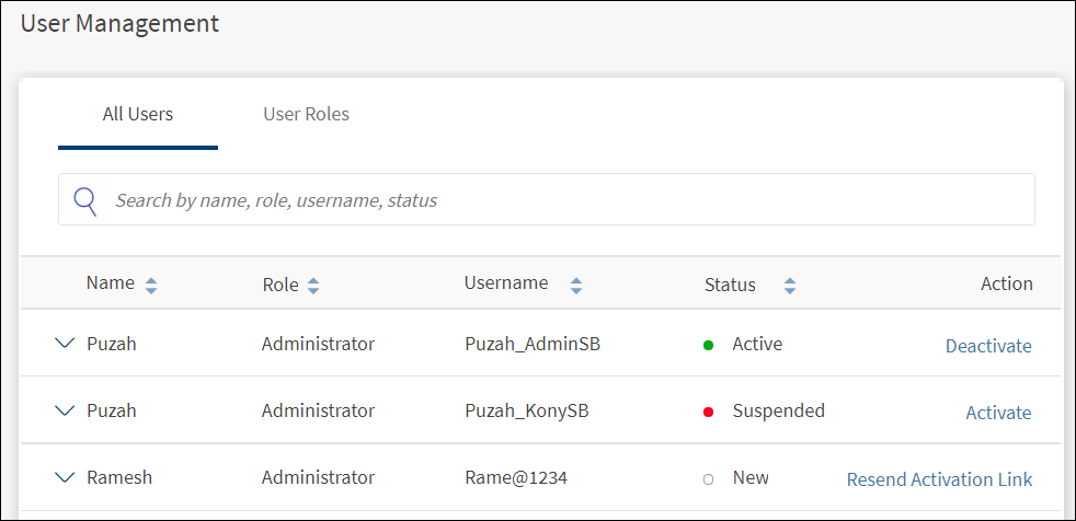 | Suspended | Activate | Click to activate the user. The status of the user is updated as Active. The user can use the same credentials that were in use prior to deactivation to sign in to the application again. |