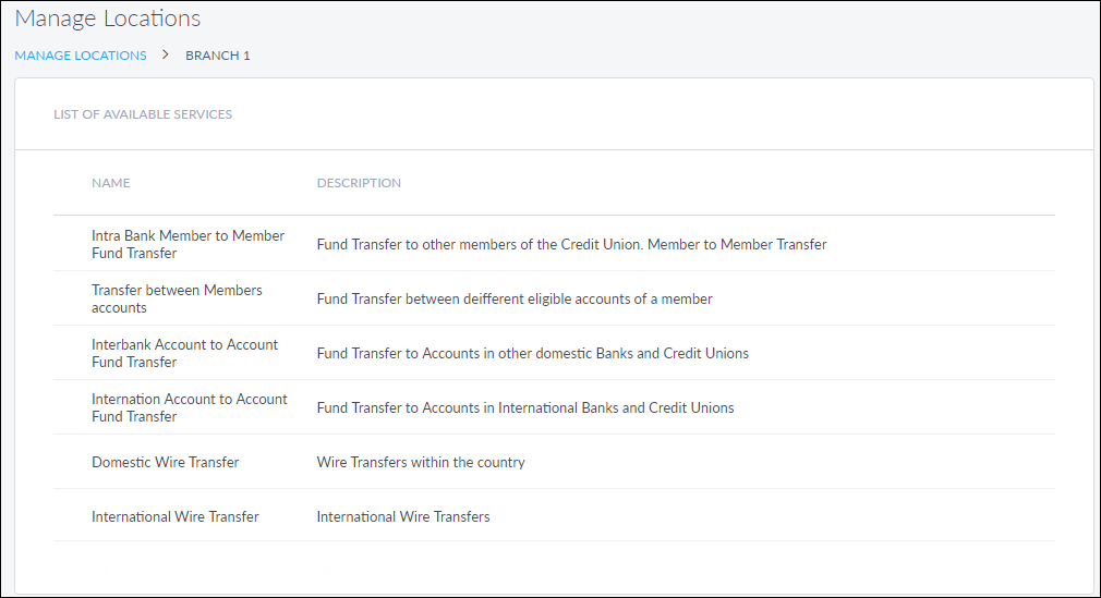 User can proceed to assign services to the branch or ATM using the Next button or the List of Services tab (this step is optional), or save the branch or ATM details directly. The branch or ATM record is added to the list of branches or ATMs.