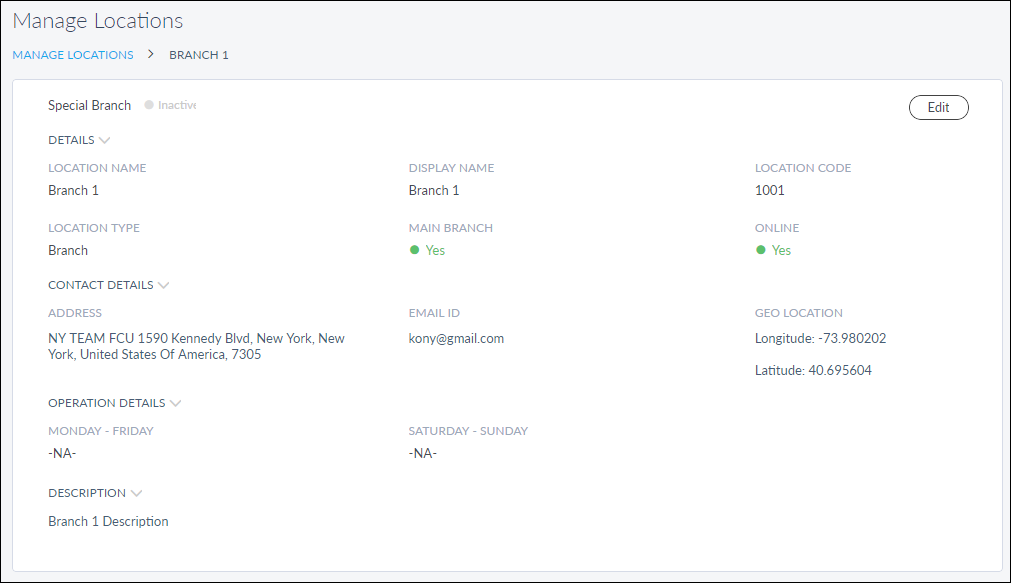 The edit screen is similar to the add a branch or ATMscreen, and allows the user to modify the details of the branch or ATM. User can make the changes as per the guidelines mentioned in Locations Details and List of Services. Save the details.