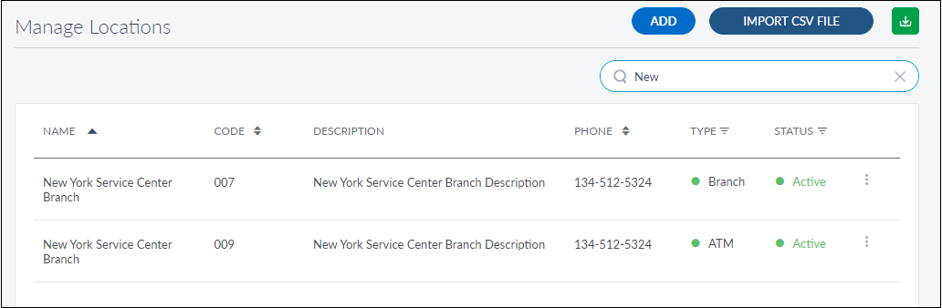 - Click Import CSV File to import a branch or ATM list. To get the template for providing the information for the required fields, click Download Template link on Import Locations pop-up.