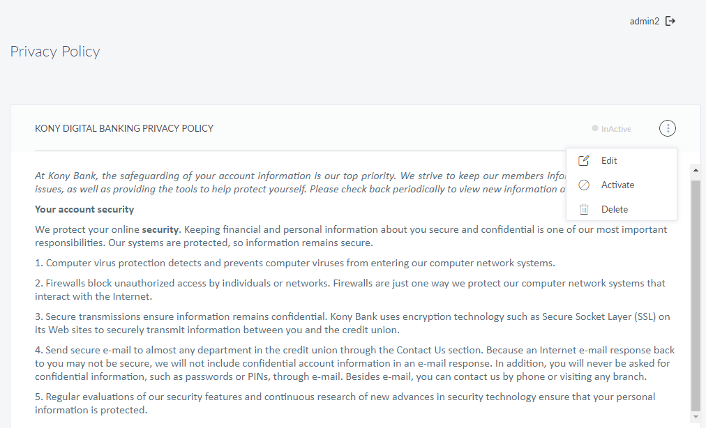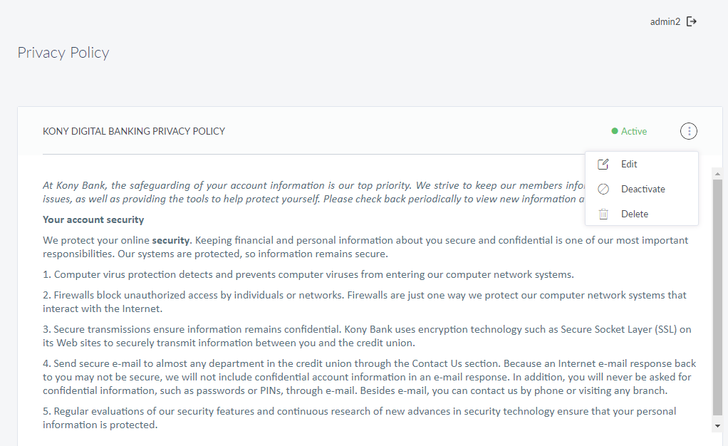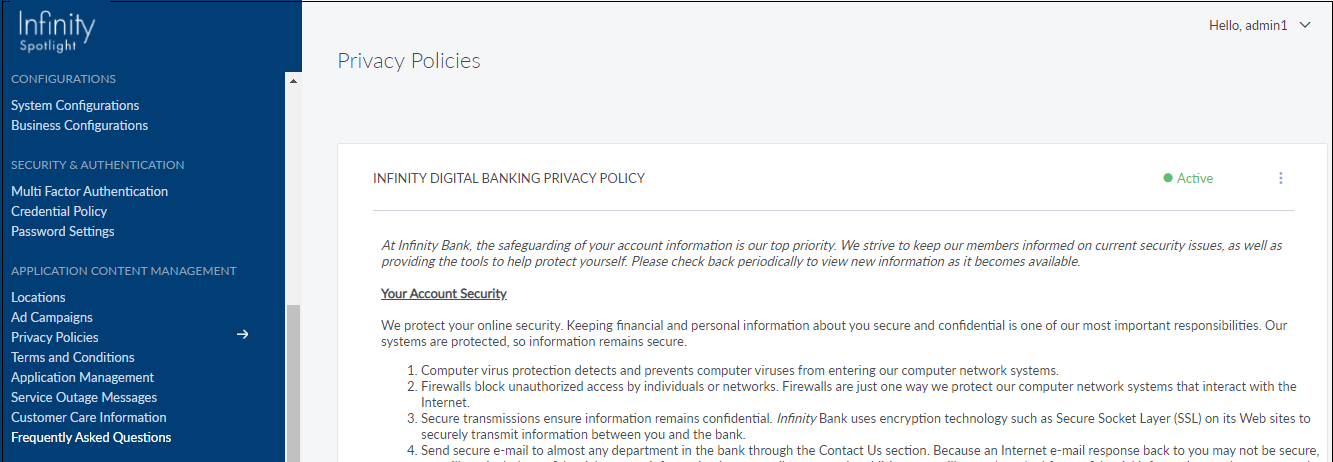 Use the feature to manage the privacy policy that is displayed to the end customer in the Retail Banking applications. Spotlight has only one Privacy Policy for the end user and hence, there is concept of adding new policies, only editing the currently added privacy policy is possible.