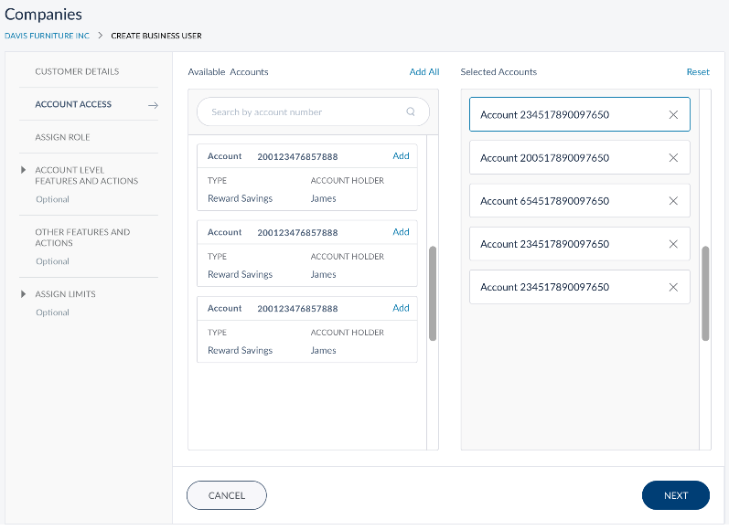 Click Add on the required accounts to add to the Selected Accounts section. The user will be able to access (view/operate) only the selected accounts when they log in to the application. Click Next. The application displays the page where you can specify the business user role.
