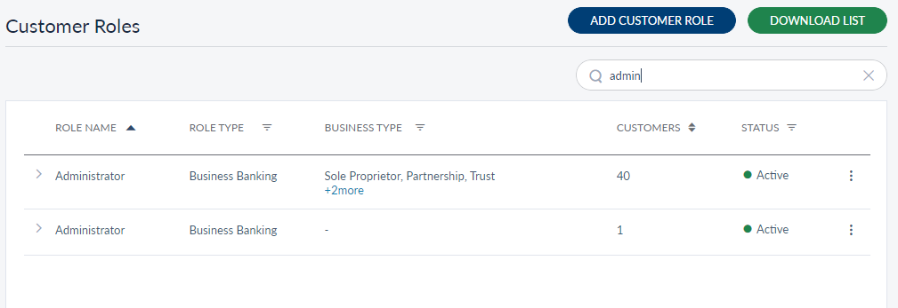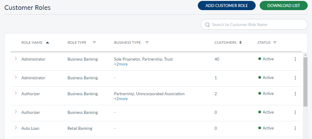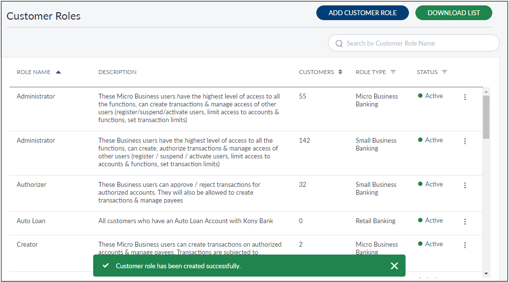 Click the contextual menu available on each row and update the status based on the current status of the customer role. The following statuses are available: Activate and Deactivate. For example, if the current status of a role is Active, you can Deactivate the role or vice versa.