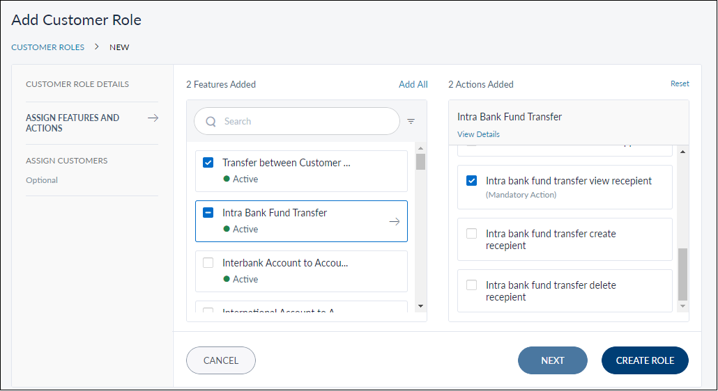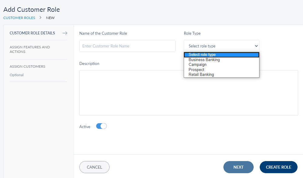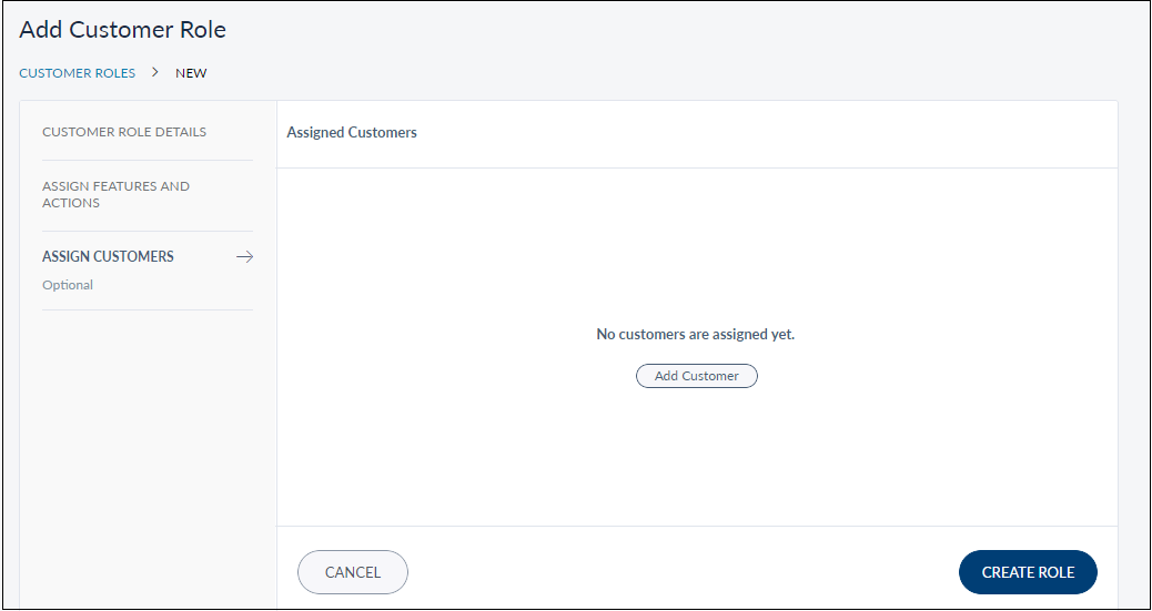 The Add Customer Role screen comprises three tabs to capture the required information - Customer Role Details, Assign Features and Actions, and Assign Customers.