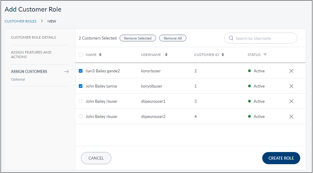 In the Assign Customers screen, the customers' list is represented as rows with the following details - Name, Username, Customer ID, and Status. Click to delete the record.