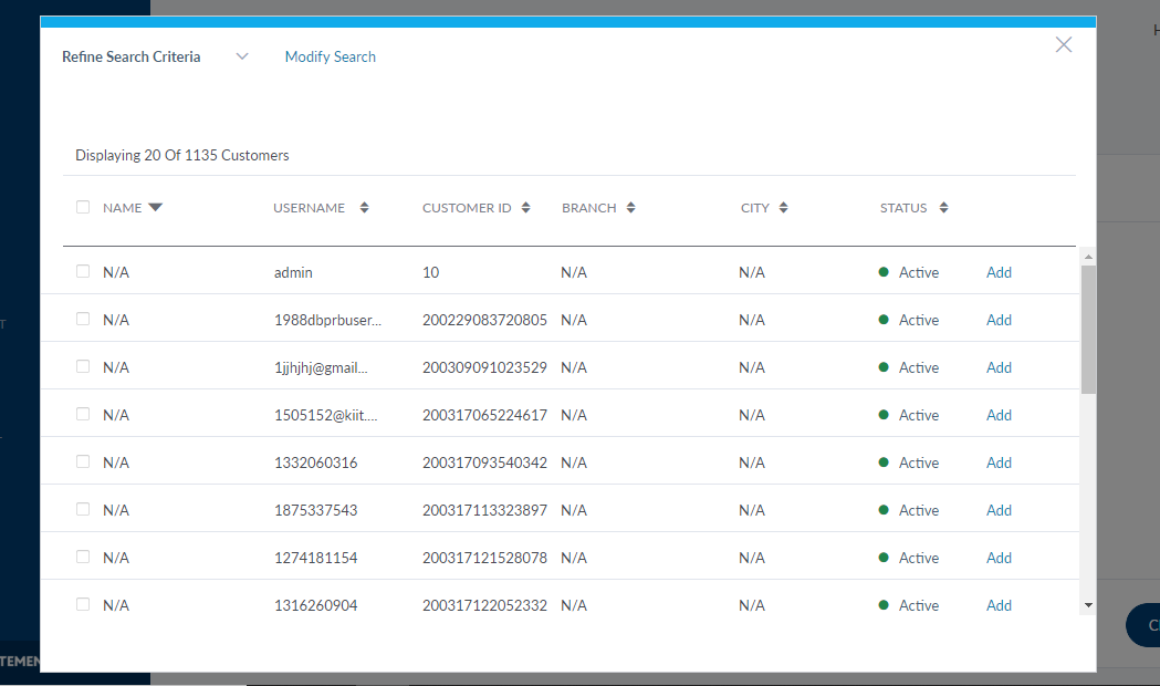 • The application displays the relevant search results list. The list contains the following details - Name, Username, Customer ID, Branch, City, and Status.
