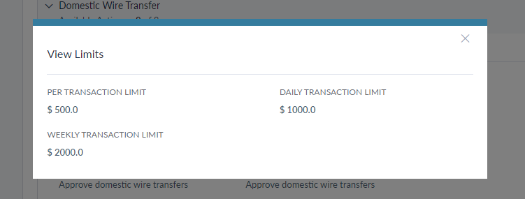 As described in Features, the services have transaction limits associated with them. When a service is assigned to a role as permission, the administrator can choose to retain the default service limit values or change them to a value less than what is set for that service. A permission's limit can never exceed what is prescribed for the bank or credit union at a service level. It is also possible to assign a permission to an individual customer. In case a customer belongs to multiple roles, the highest limit described in any of these roles will be applicable for the customer. In case an individual limit is also available for the customer, this limit will always take precedence over role limits. However, the individual limit can never exceed the service limit defined for the bank or credit union.