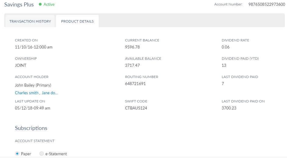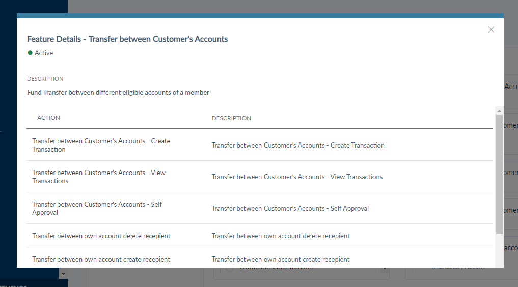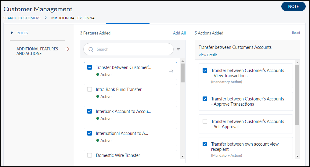 • Features and Actions: This tab contains Retail and Business Banking sub-tabs that list all the features and actions that the customer is entitled to at an account level and at a user level. A distinction is maintained between Retail and Business permissions.