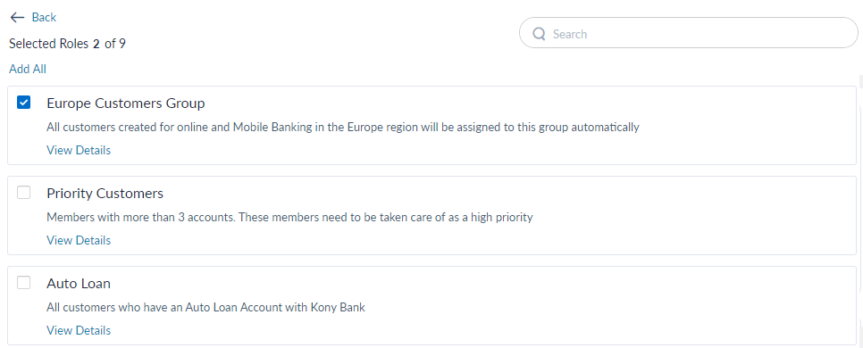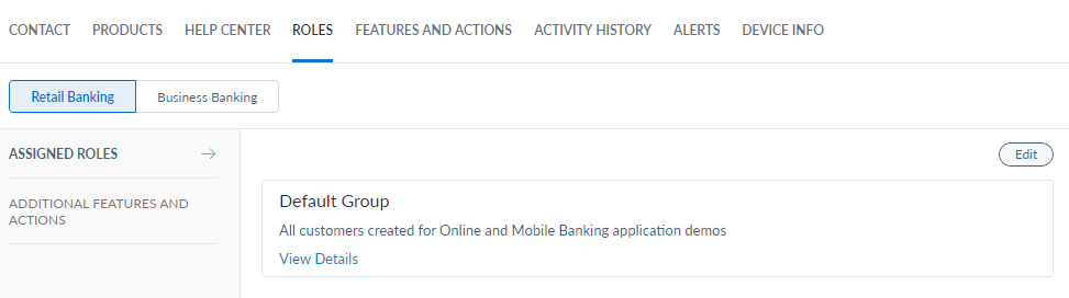 • Roles: The Roles tab contains Retail and Business Banking sub-tabs that display the role that the customer is assigned in their respective profiles. A combined user could have multiple Retail roles and additional features and actions that have been given to the user for personal use, outside of the Retail roles. A combined user would also have a business role.
