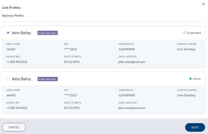 • Select the profile which you want to link and click Next. You cannot link a profile which is Suspended state.