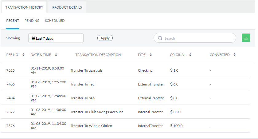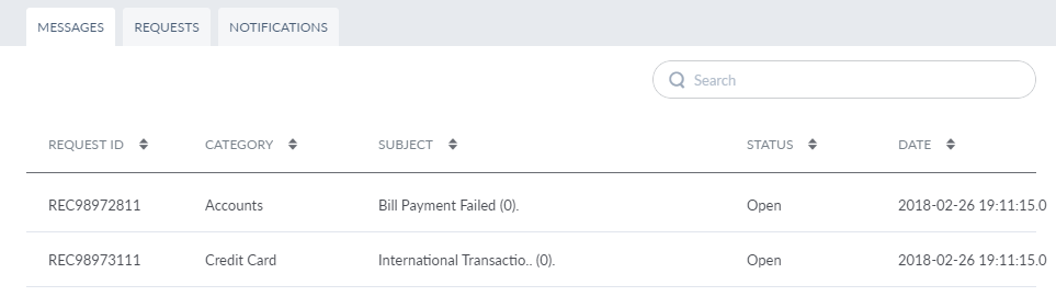 The Activity History tab displays the list of banking activities carried out by the customer. The activity history is recorded in sessions. The list displays the details of the last three sessions. To view more sessions, click View All. The app navigates you to the transaction and logs section.