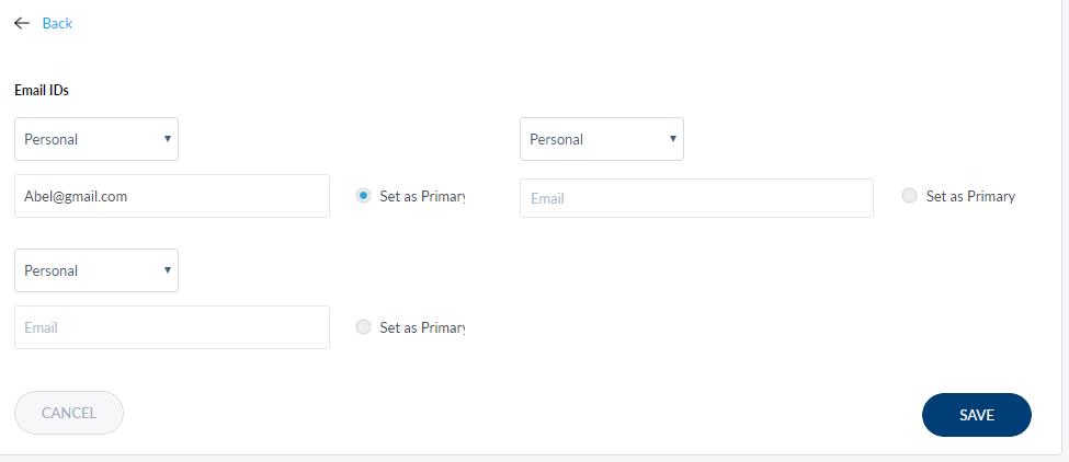 • Contact: The Retail contact and Business contact information of the customer is displayed in the respective tabs under the Contact tab. You can edit the details if you want from here. A single primary contact detail for communication exists for a combined user which is used to send alerts to the user. By default, the primary contact details are maintained set to be same as on the profile whose login credentials have been maintained for the combined user.