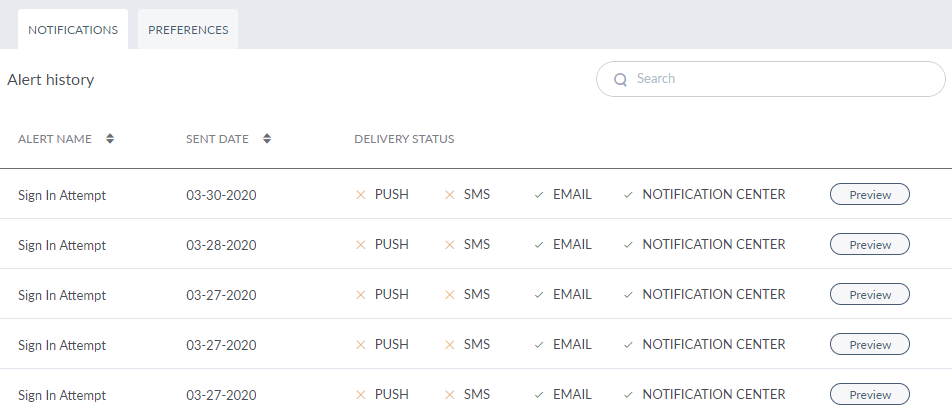 • Delivery Status: Displays through which channel the notification was sent (Push, SMS, Email, Notification Center).